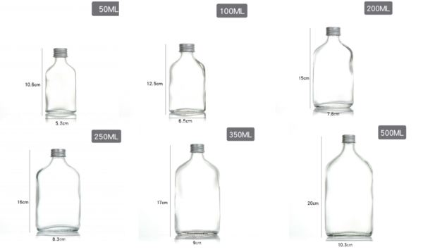 Wholesale flask glass bottle sizes from small 50ml 100ml 150ml 200ml 250ml 350ml and 500ml.